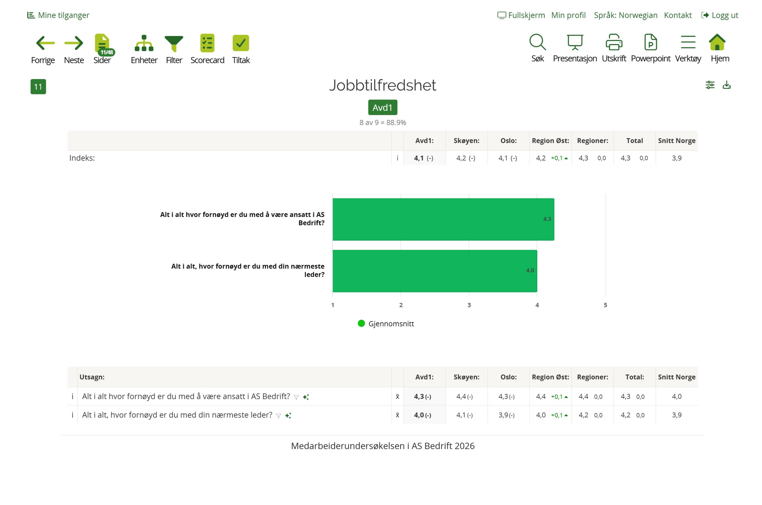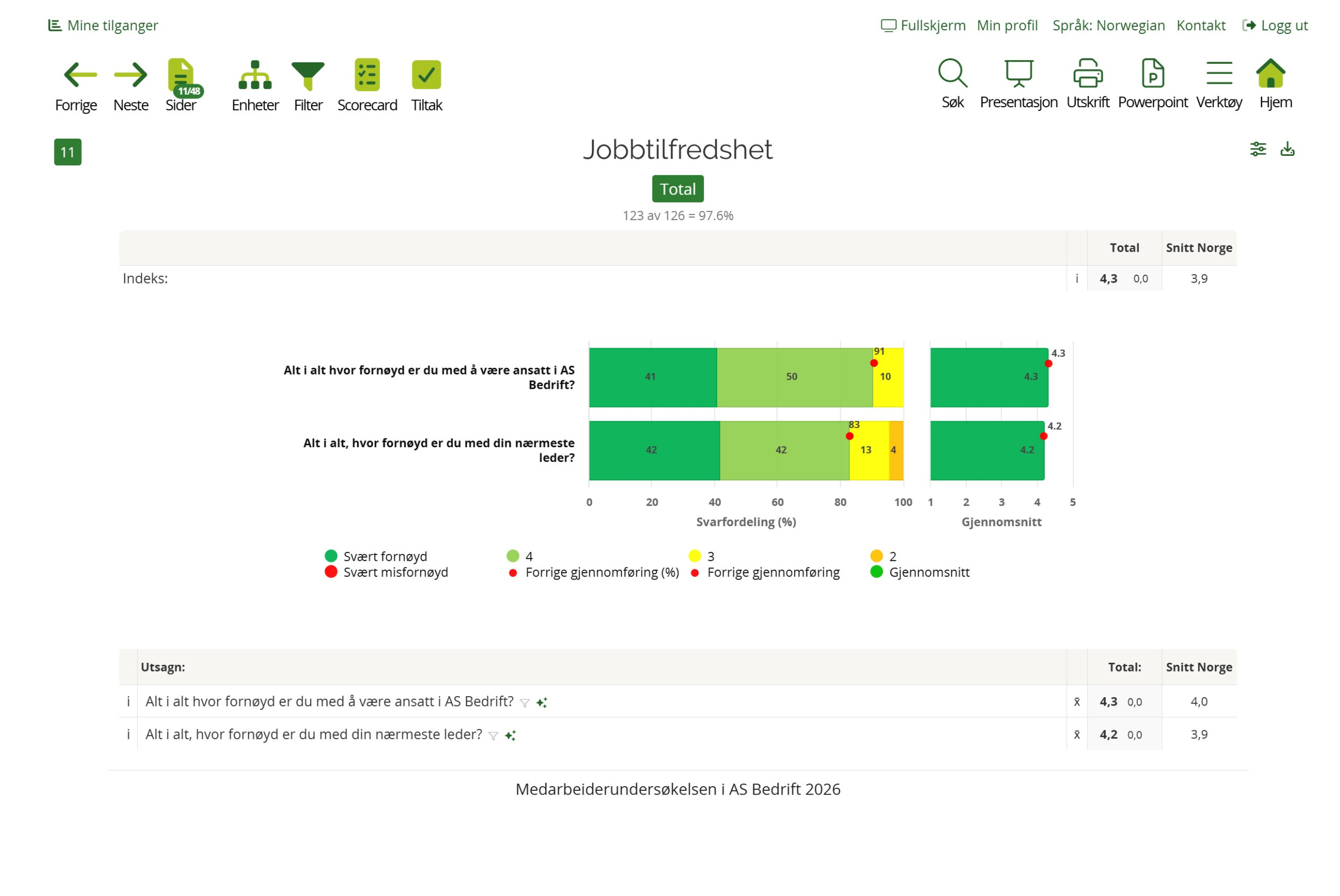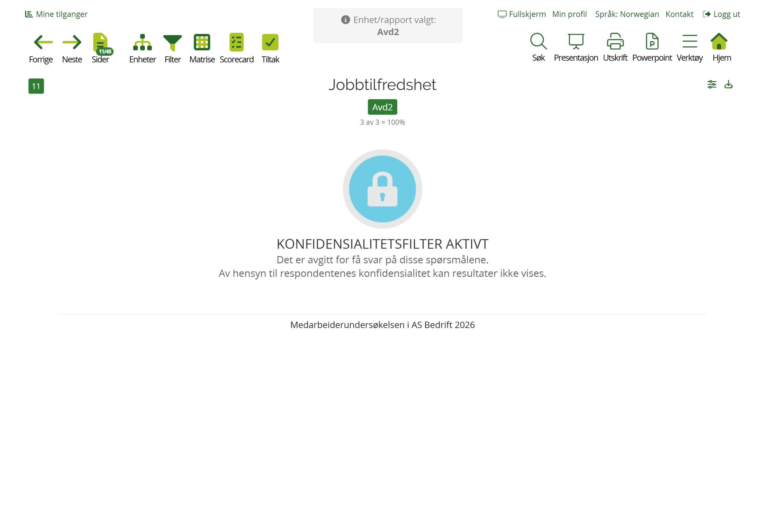 Hvis utvalget har for få svar, blokkeres rapport. Første trinn i konfidensialitetsfilteret viser gjennomsnitt eller andel positive svar og siste trinn viser full svarfordeling.